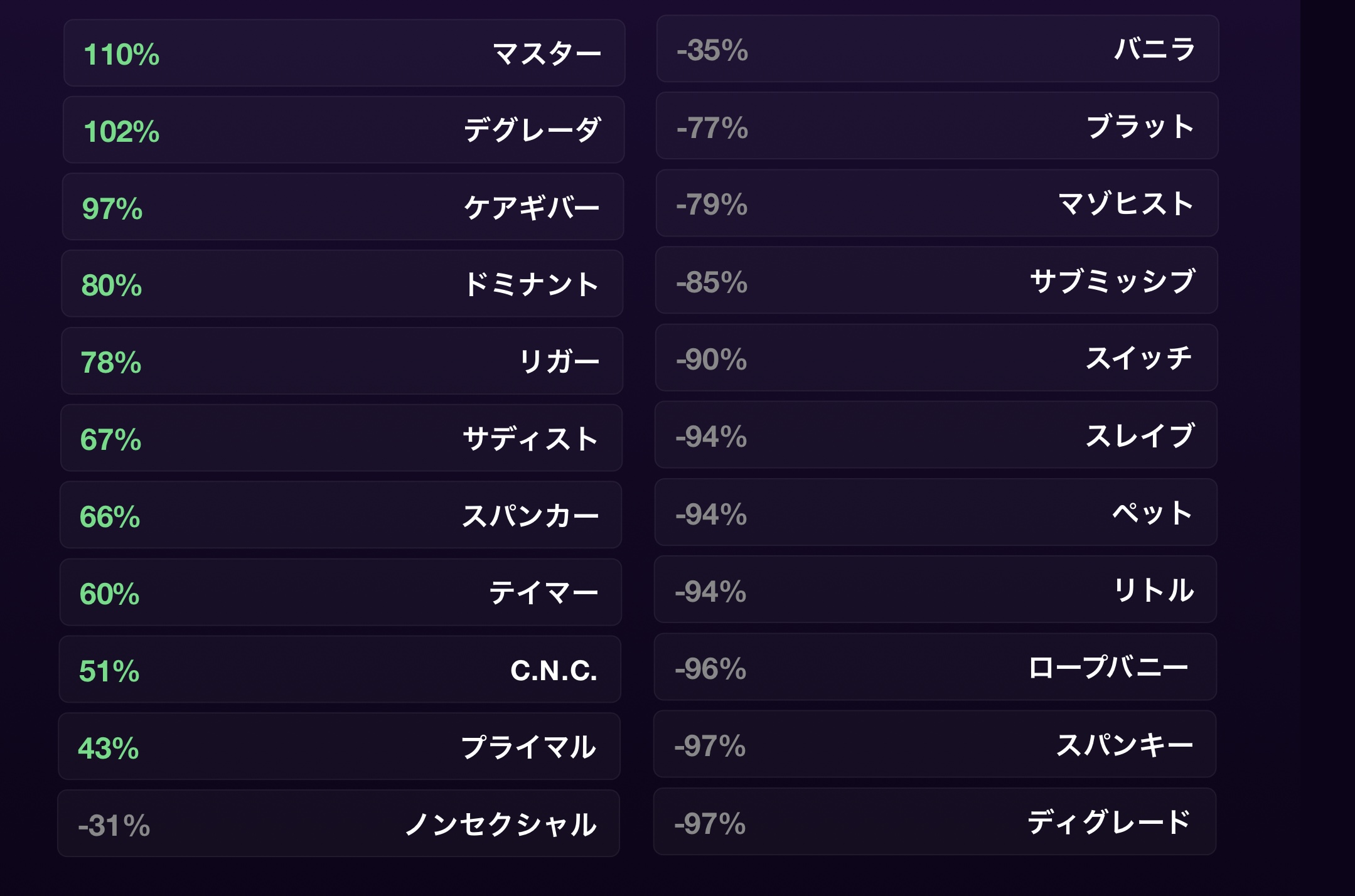 マスター、ケアギバー、デグレーダ、ドミナント傾向がかなり高く出ました。